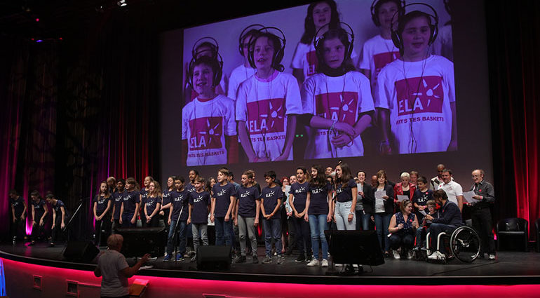 Après ces deux prestations, les parrains présents sont montés sur scène pour entonner en chœur avec les élèves de la chorale du collège Jean Lurçat la chanson « Pour les enfants d’ELA ».