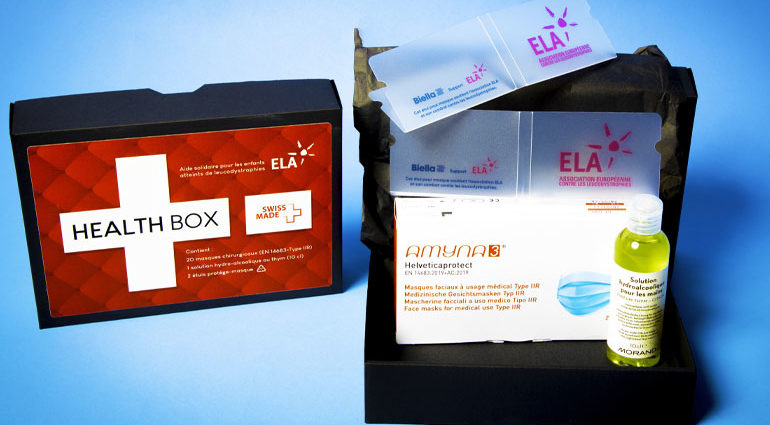 Le coffret solidaire HEALTH BOX SWISS MADE, créé par ELA Suisse, contient 20 masques chirurgicaux, 1 solution hydroalcoolique et 2 étuis protège-masques. Pour réaliser ce kit sanitaire, ELA Suisse s’est entourée de trois entreprises helvétiques sensibles à la cause d’ELA : la Distillerie Louis Morand & Cie pour la solution hydroalcoolique, Amyna3 pour les masques chirurgicaux et Biella Suisse pour les protège-masques. Ces entreprises de renom ont conçu et développé des produits de haute qualité, estampillés Swiss Made, répondant à toutes les normes de certification.